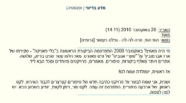 2. אתר נהדר, עבודה נפלאה. ניכרת אהבת התחום אצל העורך, אצל הכותבים, אצל הקוראים. למעשה, אתר מעין זה הוא צורך דוחק, ואני מודה לך ולחברים על כך שענו על הצורך, ומילאו את החסר. תענוגות.